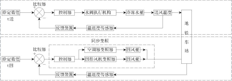 組合式空調(diào)機(jī)組送風(fēng)口、回風(fēng)口、新風(fēng)口均設(shè)溫度傳感器T送,T回,T新,其中T送信號(hào)反饋給空調(diào)機(jī)組的比例積分調(diào)節(jié)閥,T回反饋給空調(diào)機(jī)組的電動(dòng)機(jī)變頻器,空調(diào)機(jī)組的調(diào)節(jié)閥和變頻器同時(shí)調(diào)節(jié),實(shí)現(xiàn)水系統(tǒng)和風(fēng)系統(tǒng)聯(lián)動(dòng)控制,最大程度降低地車車站的空調(diào)運(yùn)行能耗。